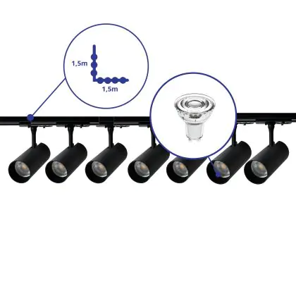 | Manufacturer Name | Complete L shaped 1-Phase Track Set Black incl. 7x Spot fixture + GU10 2700K 3W Dim – 1,5 x 1,5 mete | |